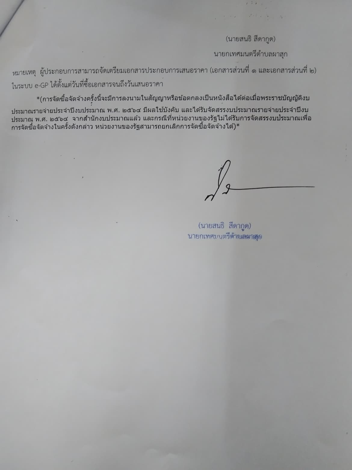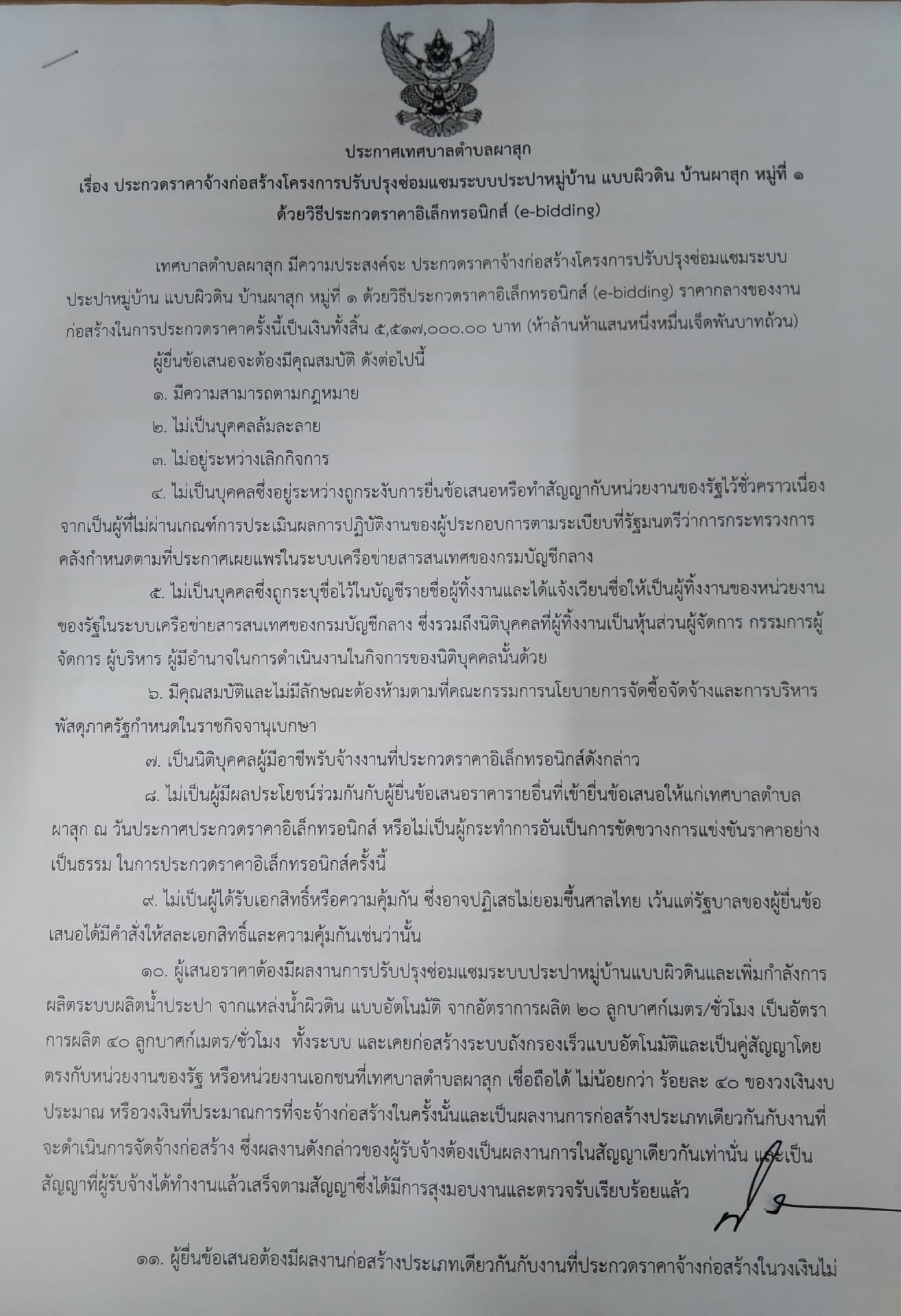 ประกวดราคาจ้างก่อสร้างโครงการปรับปรุงซ่อมแซมระบบประปาหมู่บ้าน แบบผิวดิน บ้านผาสุก หมู่ที่ 1