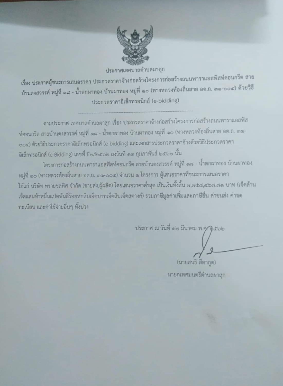 ประกาศผู้ชนะการเสนอราคา โครงการก่อสร้างถนนบ้านดงสวรรค์-น้ำตกผาทอง บ้านผาทอง