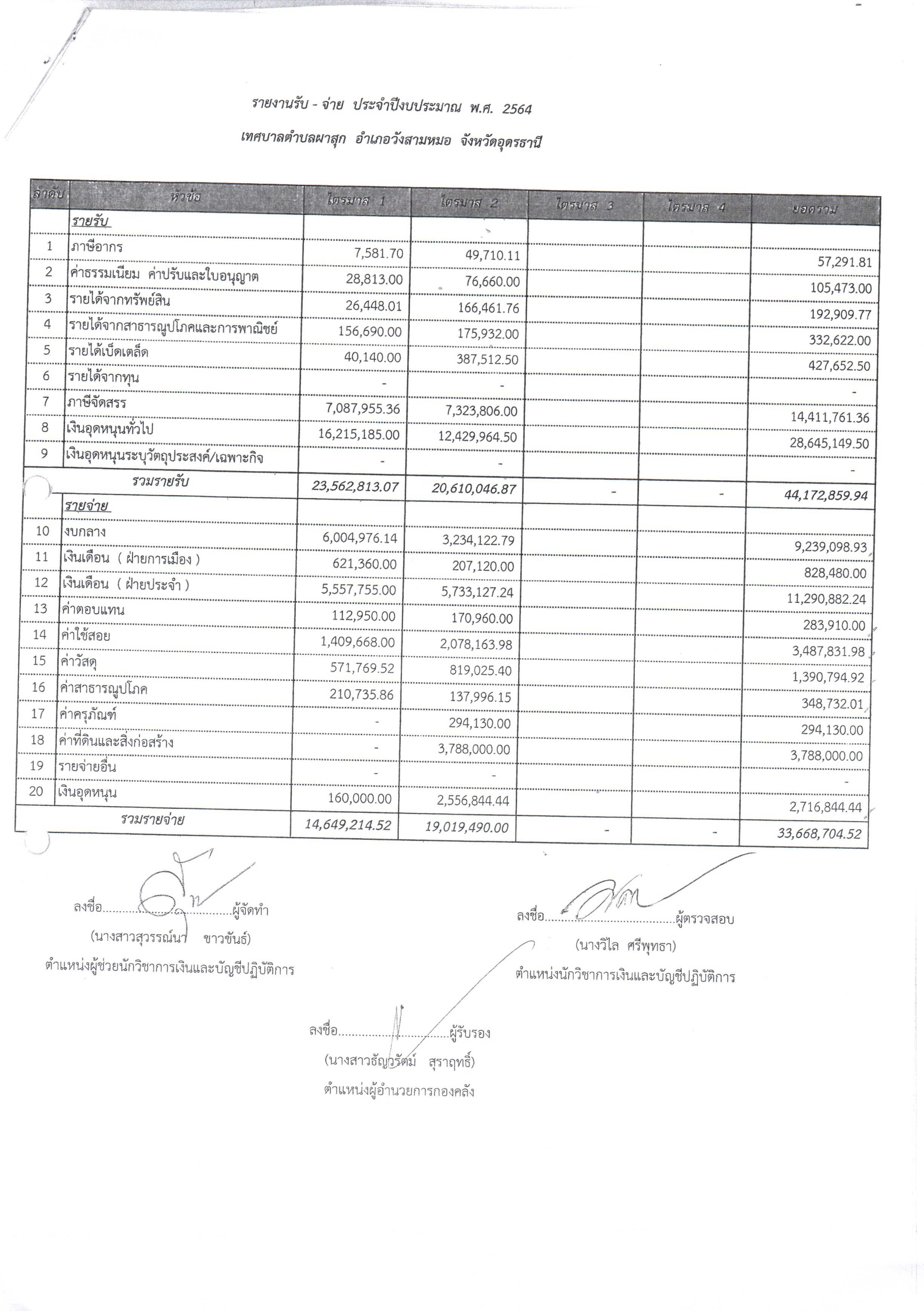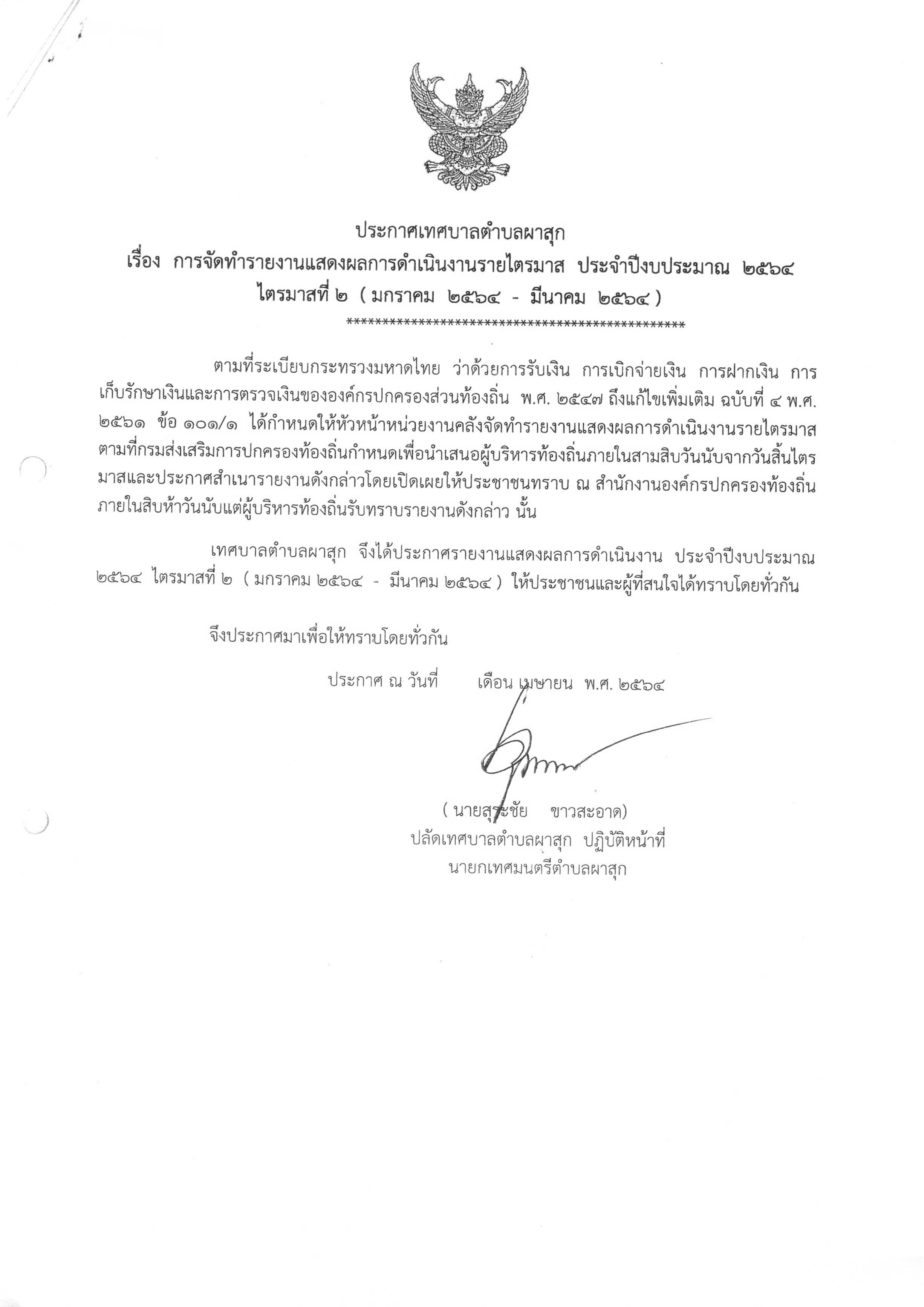 ประกาศ เรื่อง การจัดทำรายงานแสดงผลการดำเนินงานรายไตรมาส ประจำปีงบประมาณ 2564 ไตรมาสที่ 2