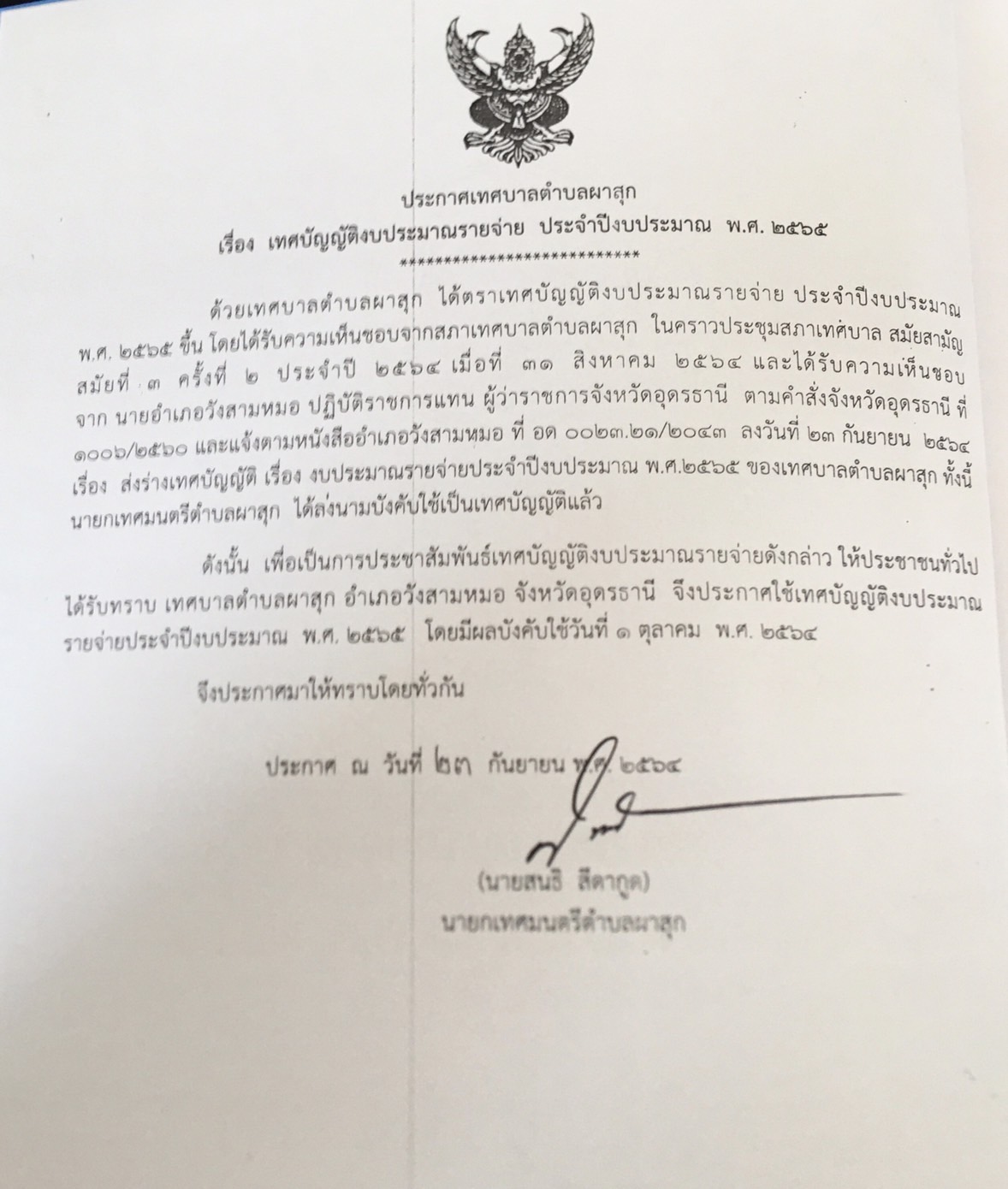 ประกาศ เรื่อง ข้อบัญญัติ งบประมาณรายจ่ายประจำปีงบประมาณ พ.ศ. 2565