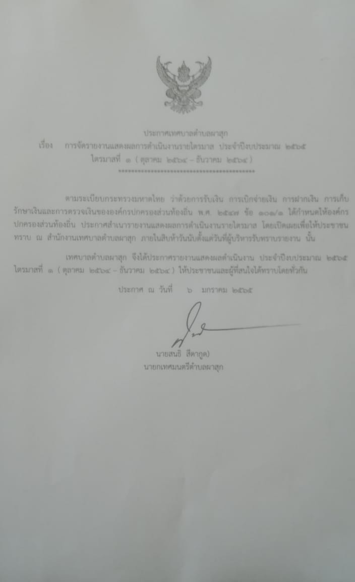 ประกาศ เรื่อง การจัดรายงานแสดงผลการดำเนินงานรายไตรมาส ประจำปีงบประมาณ 2565