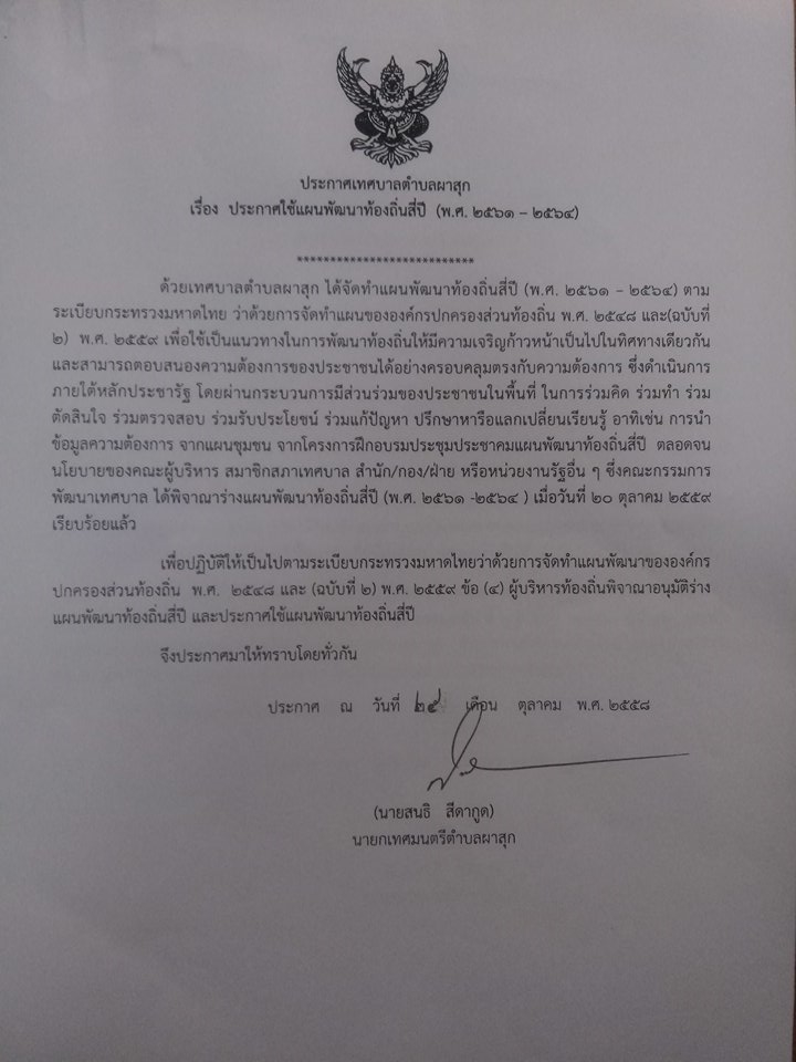 ประกาศใช้แผนพัฒนาท้องถิ่นสี่ปี (พ.ศ. ๒๕๖๑- ๒๕๖๔ )