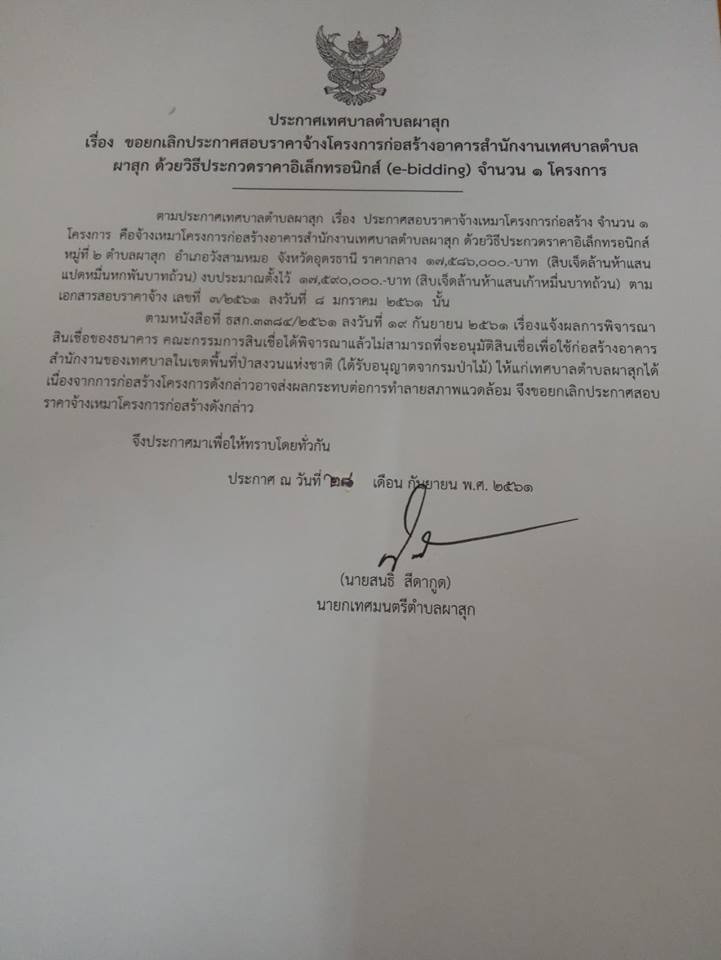 ขอยกเลิกประกาศสอบราคาจ้างโครงการก่อสร้างอาคารสำนักงานเทศบาลตำบลผาสุก