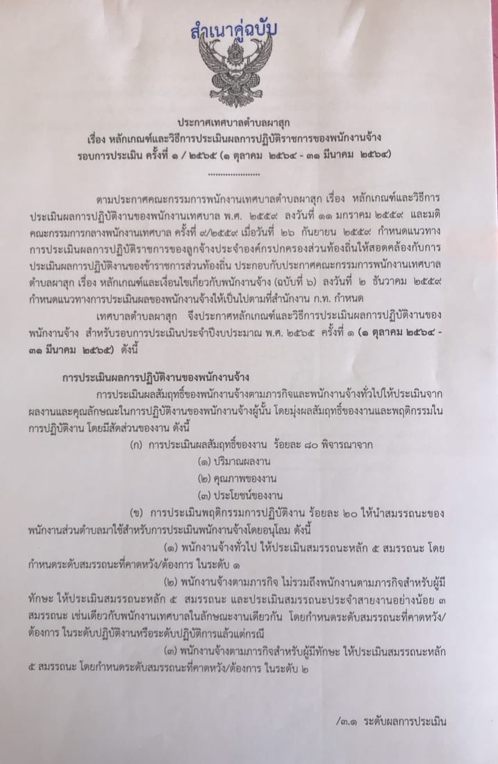 ประกาศ เรื่อง หลักเกณฑ์และวิธีการประเมินผลการปฏิบัติราชการของพนักงานจ้าง