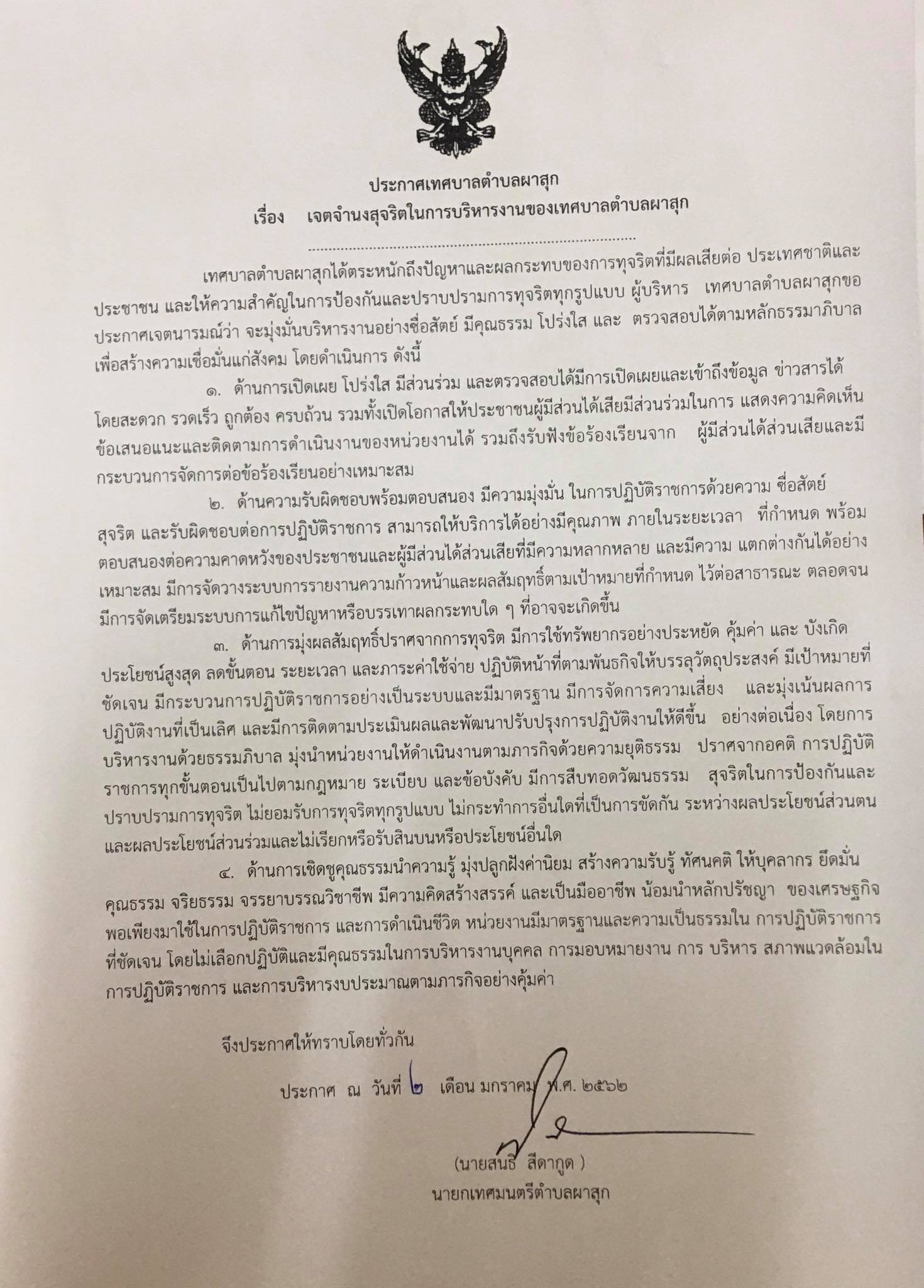 เจตจำนงสุจริตในการบริหารงานของเทศบาลตำบลผาสุก