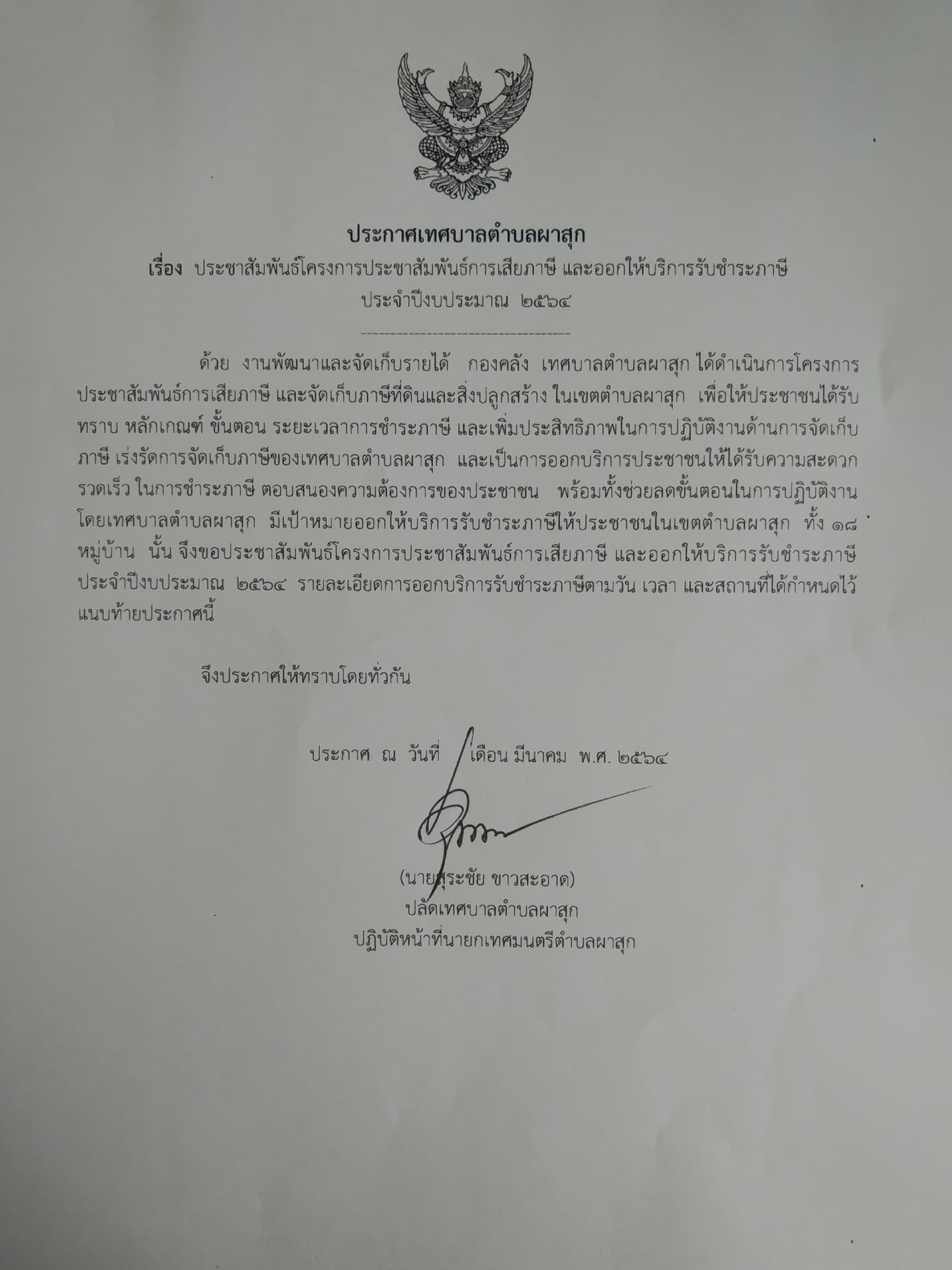 ประชาสัมพันธ์โครงการประชาสัมพันธ์การเสียภาษี และออกให้บริการรับชำระภาษี ประจำปีงบประมาณ 2564