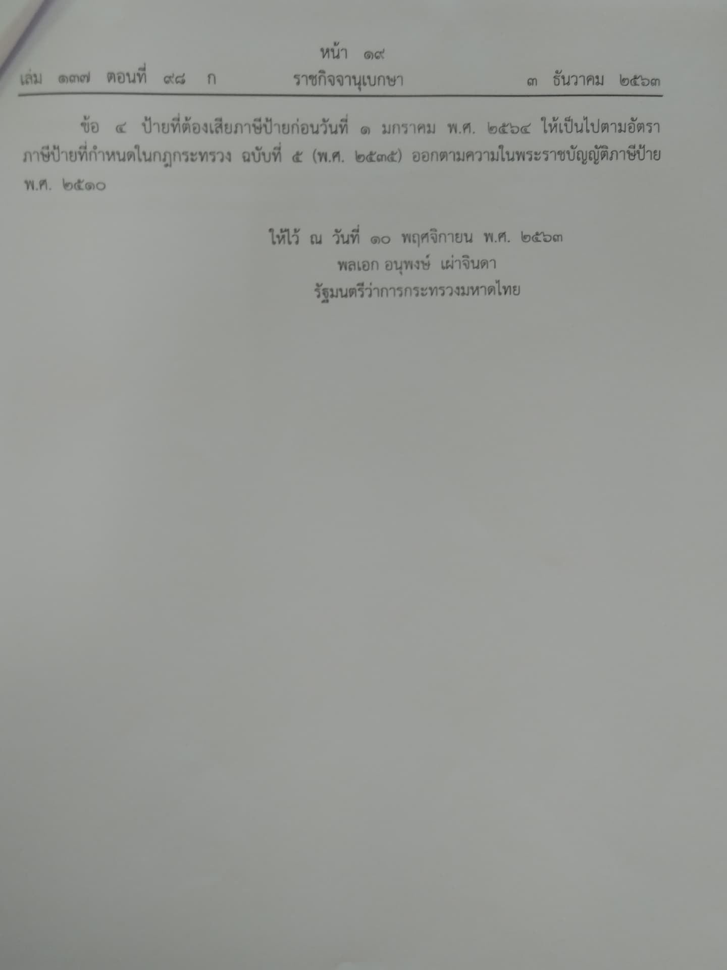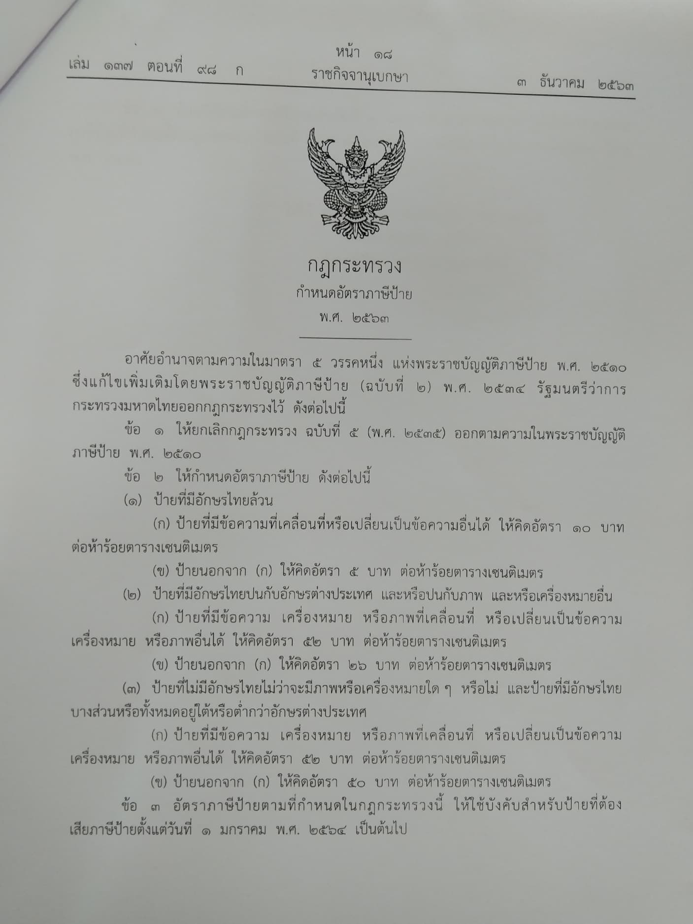 ประกาศ เรื่อง แจ้งปรับปรุงการกำหนดอัตราภาษีป้าย ตามกฎกระทรวงกำหนดอัตราภาษีป้าย พ.ศ. ๒๕๖๓