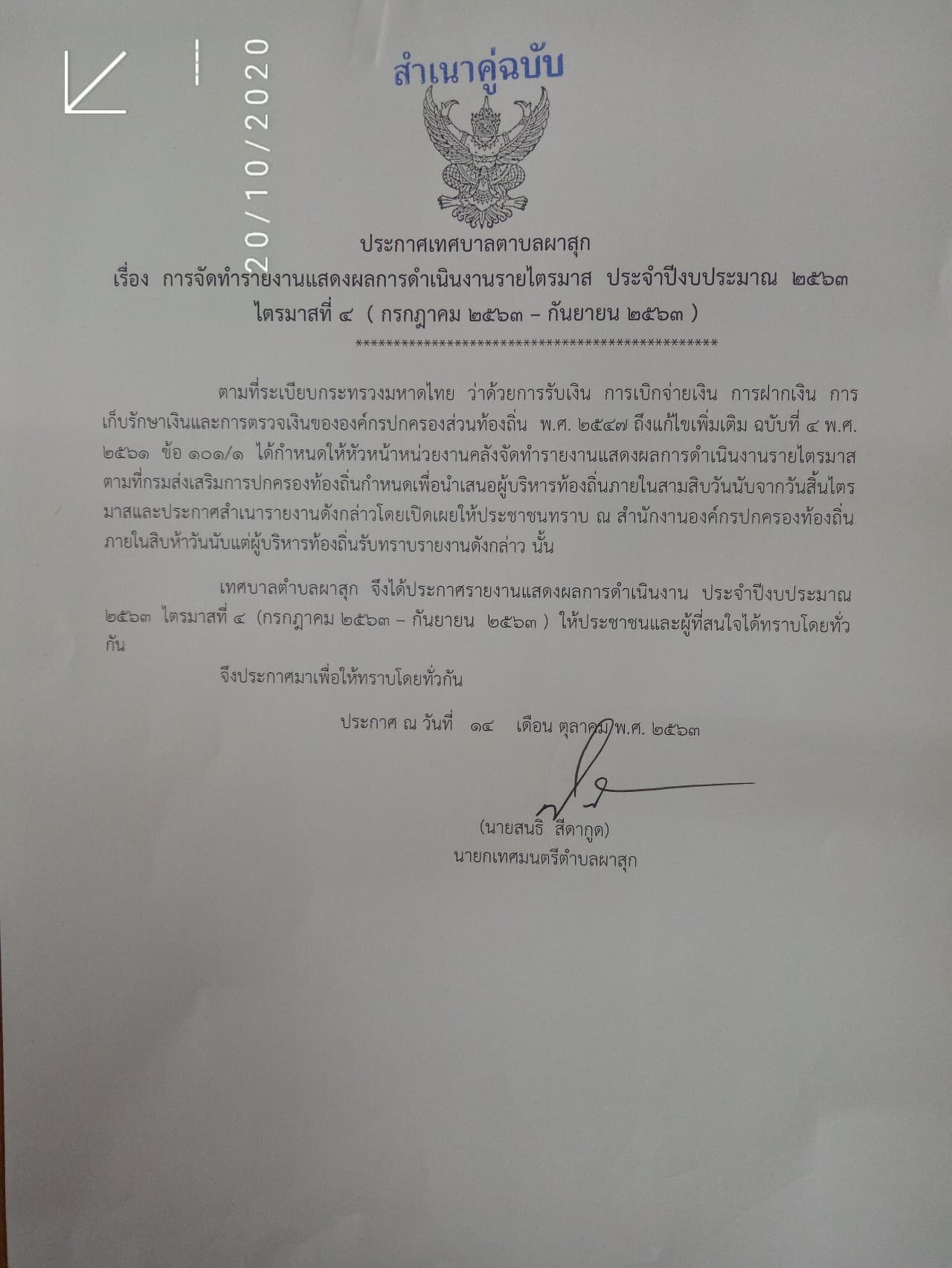 ประกาศ เรื่อง การจัดทำรายงานแสดงผลการดำเนินงานรายไตรมาส ประจำปีงบประมาณ 2563 ไตรมาสที่ 4 (กรกฎาคม 2563 - กันยายน 2563)