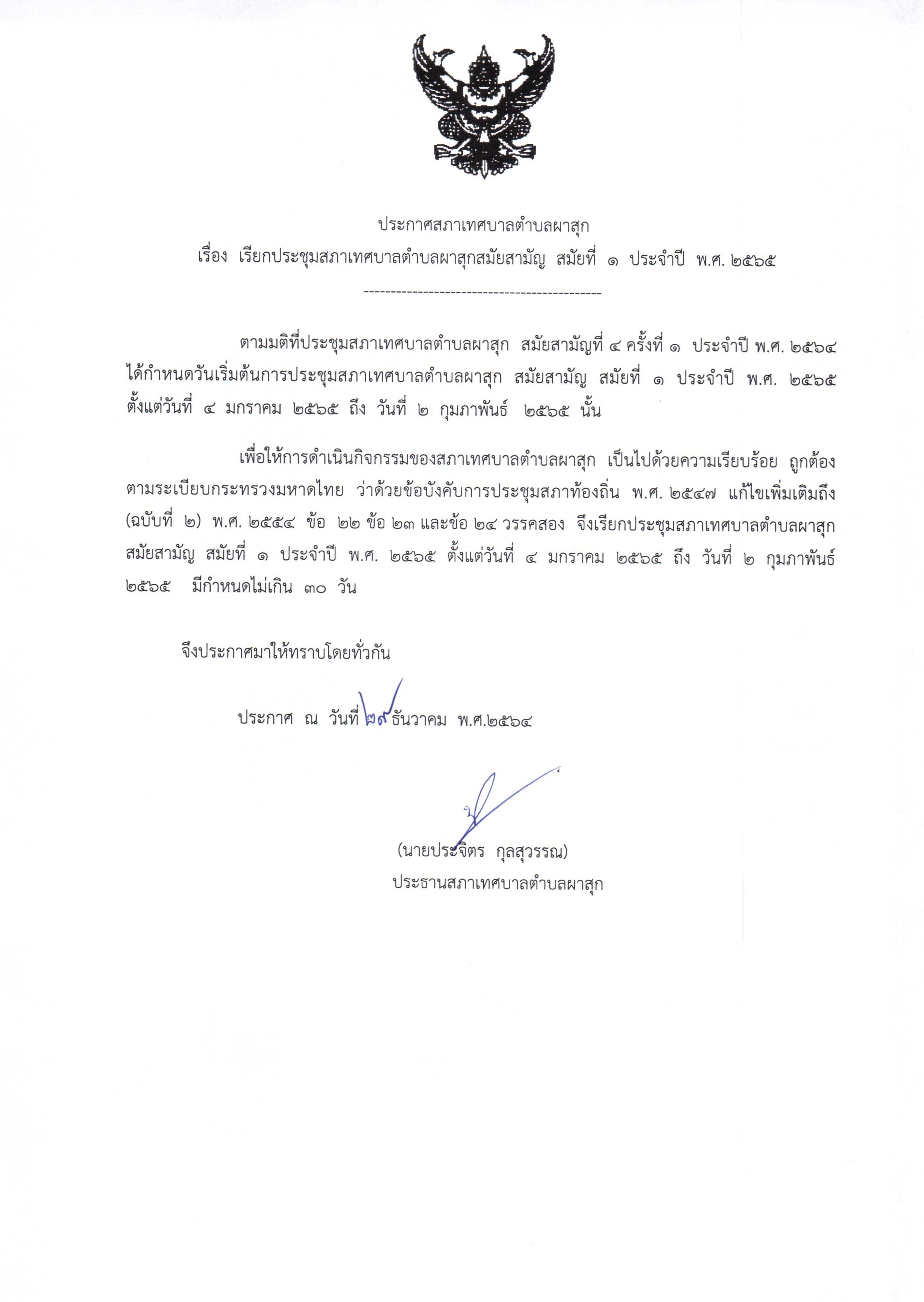 ประกาศ เรื่อง เรียกประชุมสภาเทศบาลตำบลผาสุก สมัยสามัญ สมัยที่ 1 ประจำปี พ.ศ. 2565