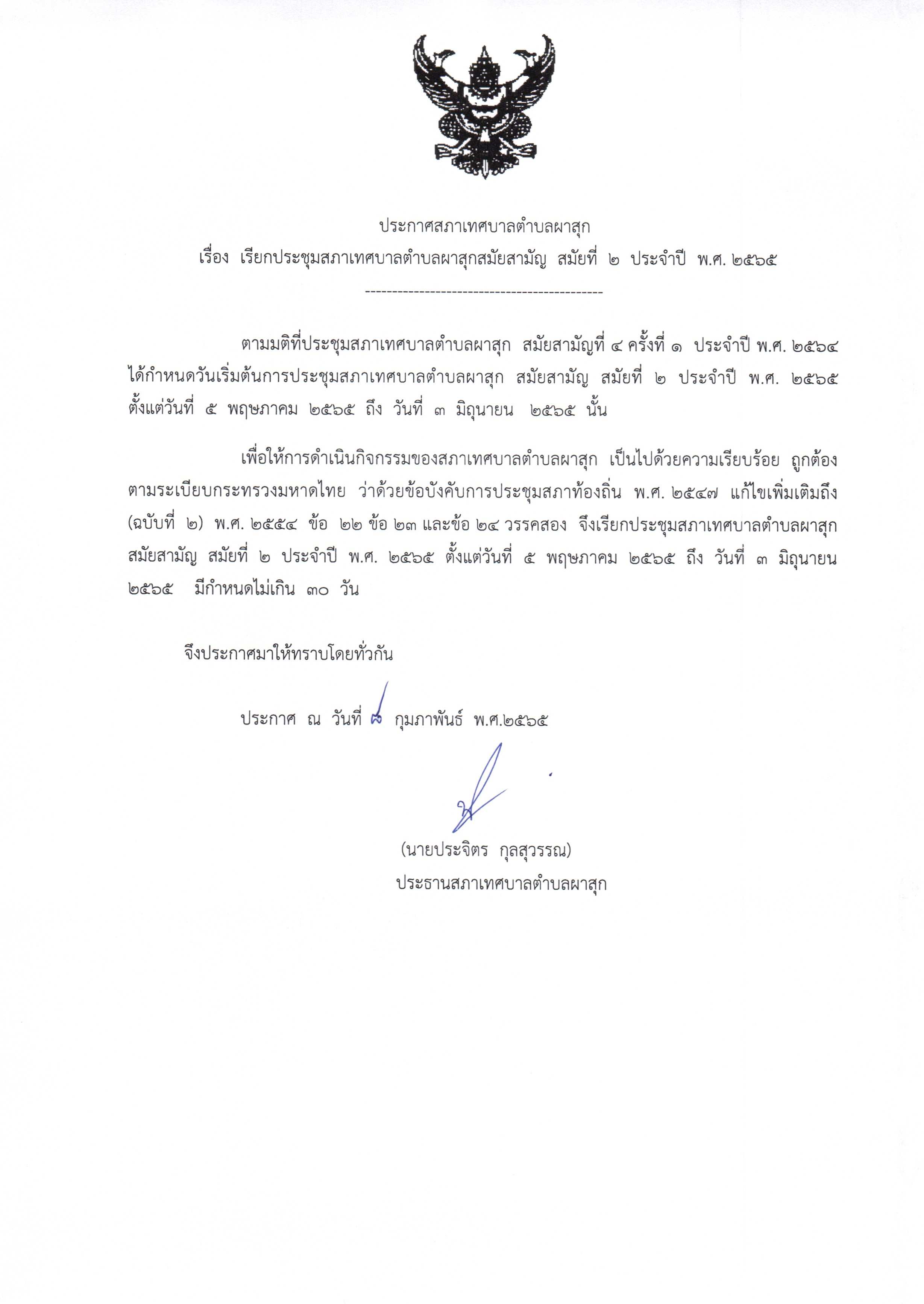 ประกาศ เรื่อง เรียกประชุมสภาเทศบาลตำบลผาสุก สมัยสามัญ สมัยที่ 2 ประจำปี พ.ศ. 2565