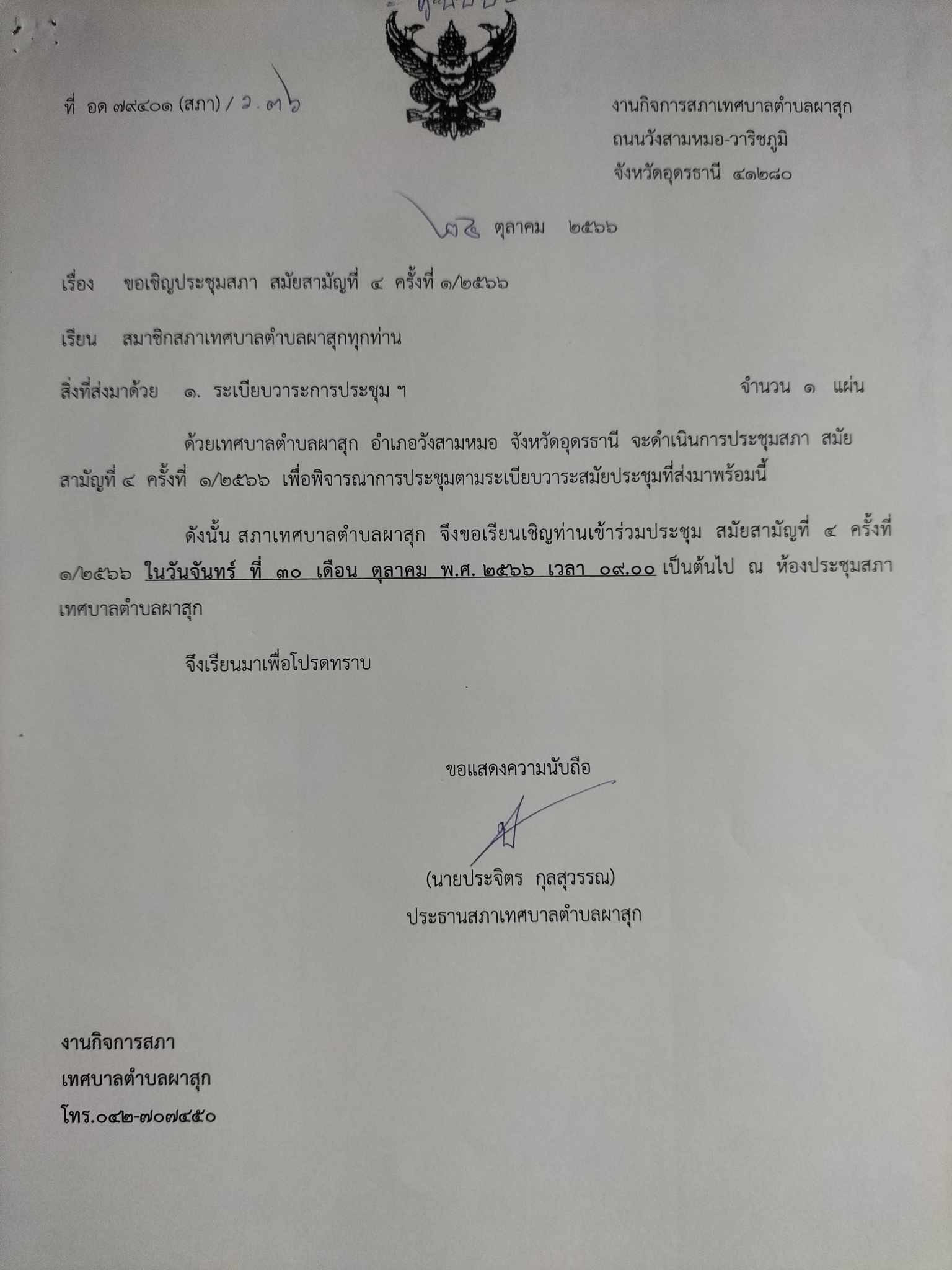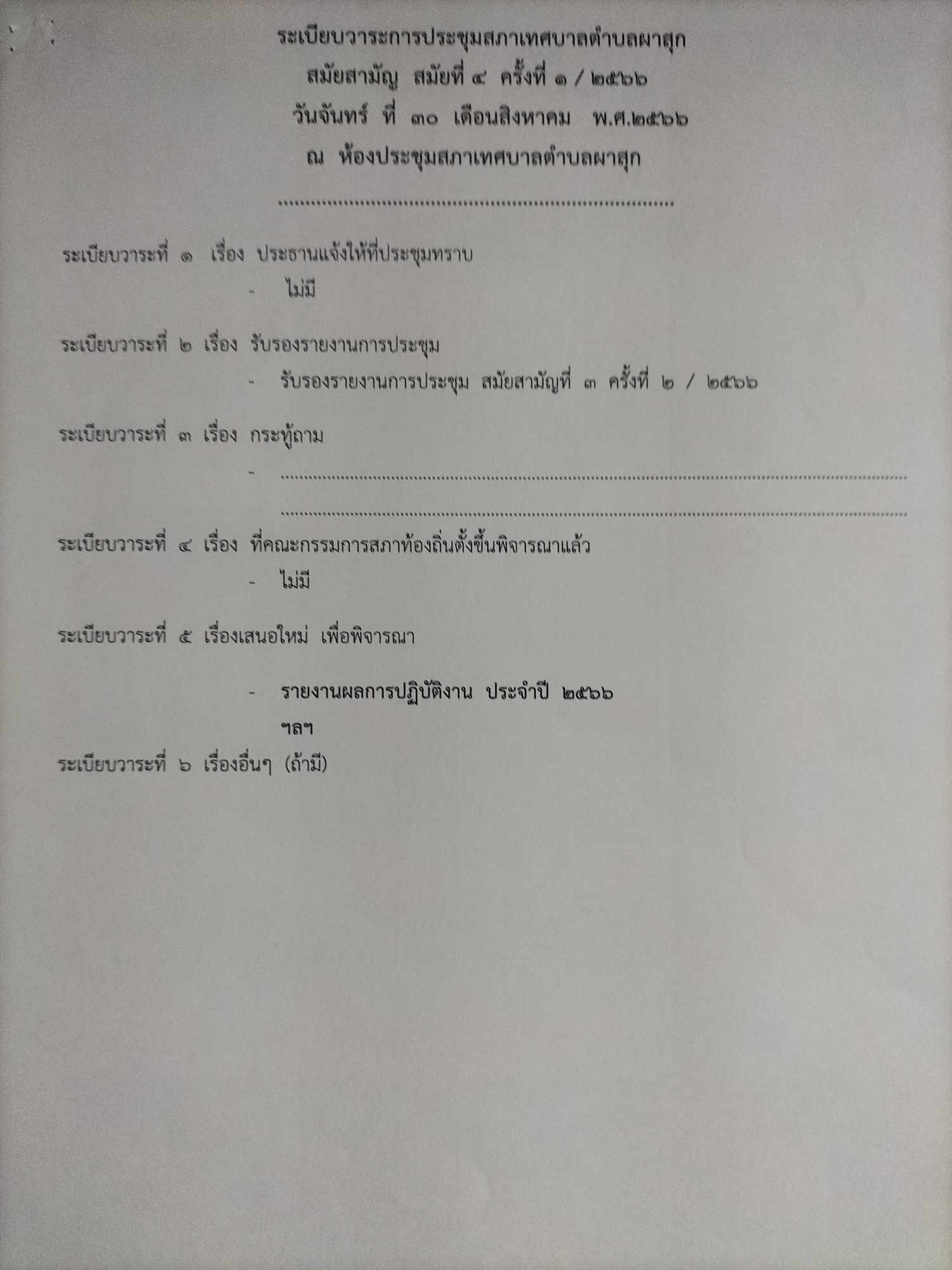 ประชุมสภาเทศบาลตำบลผาสุก สมัยสามัญที่ 4 ครั้งที่ 1 /2566