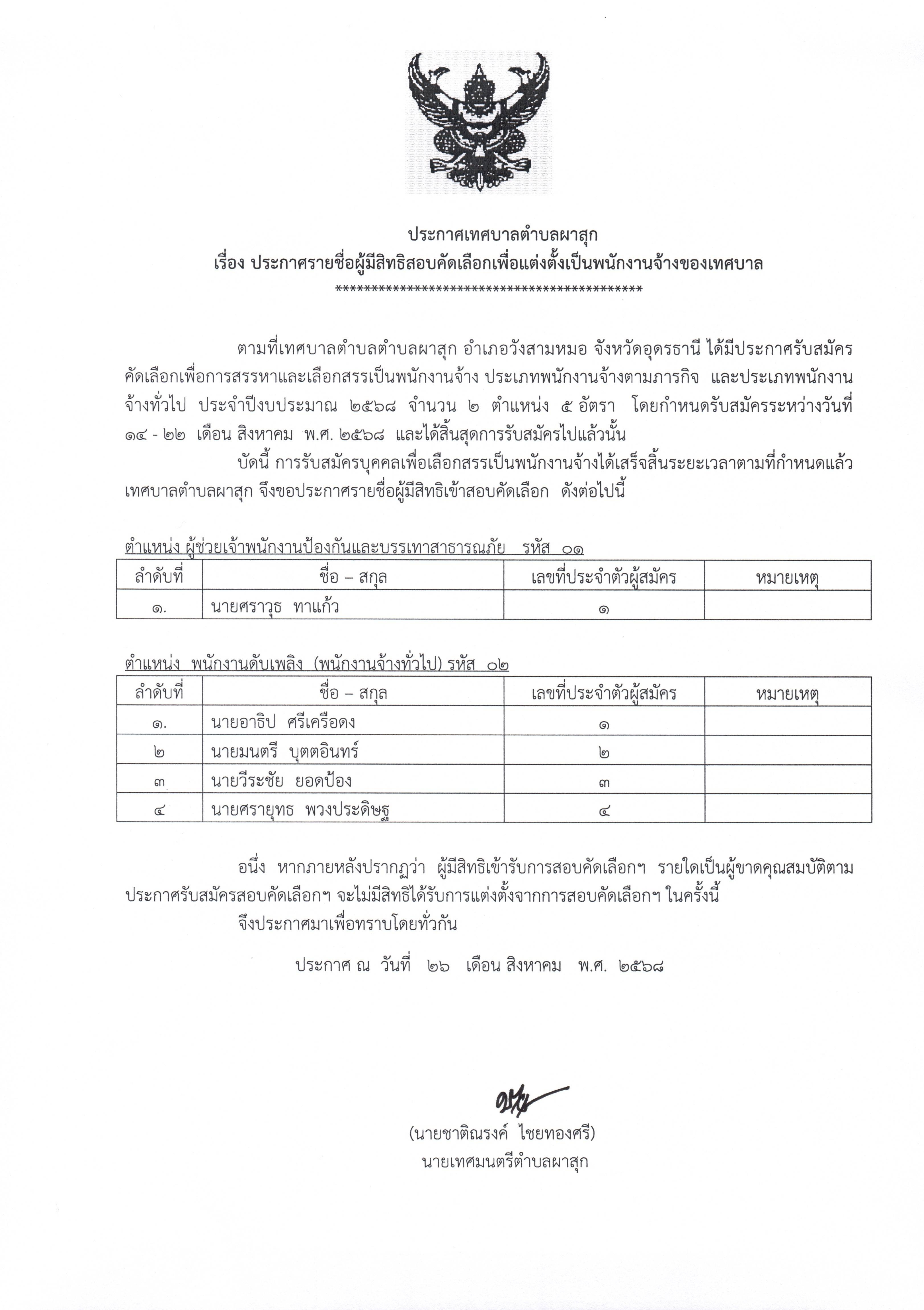 ประกาศ เรื่อง ประกาศรายชื่อผู้มีสิทธิสอบคัดเลือกเพื่อแต่งตั้งเป็นพนักงานจ้างของเทศบาล