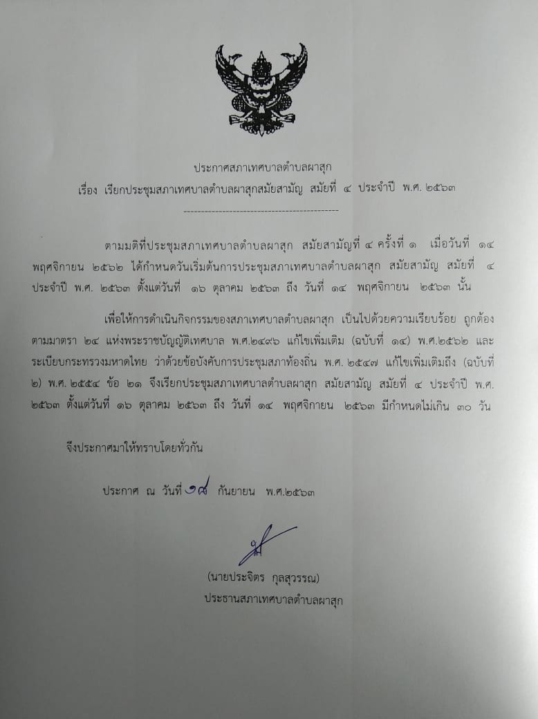 ประกาศ เรื่อง เรียกประชุมสภาเทศบาลตำบลผาสุก สมัยที่ ๔
