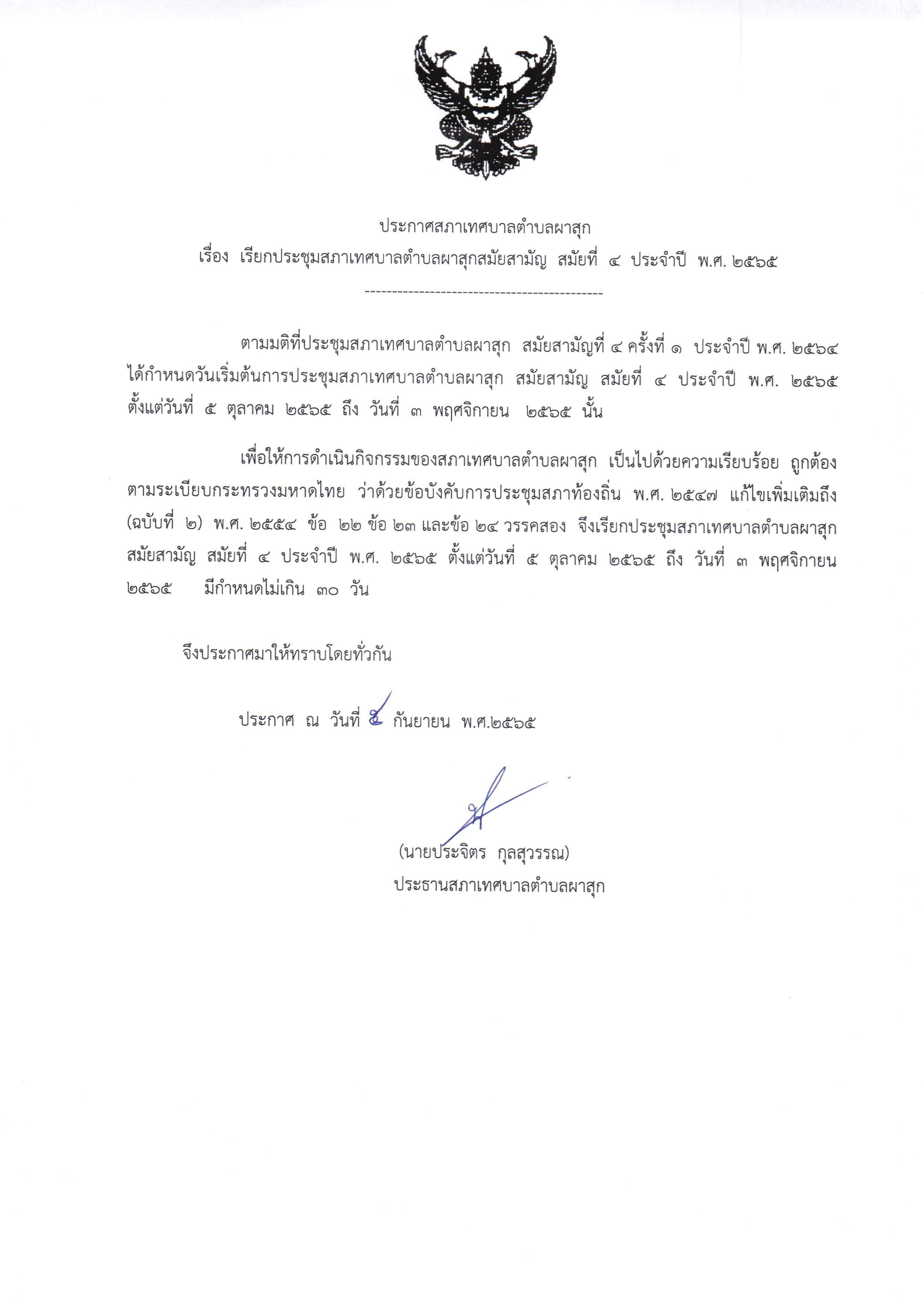ประกาศ เรื่อง เรียกประชุมสภาเทศบาลตำบลผาสุก สมัยสามัญ สมัยที่ 4 ประจำปี พ.ศ. 2565