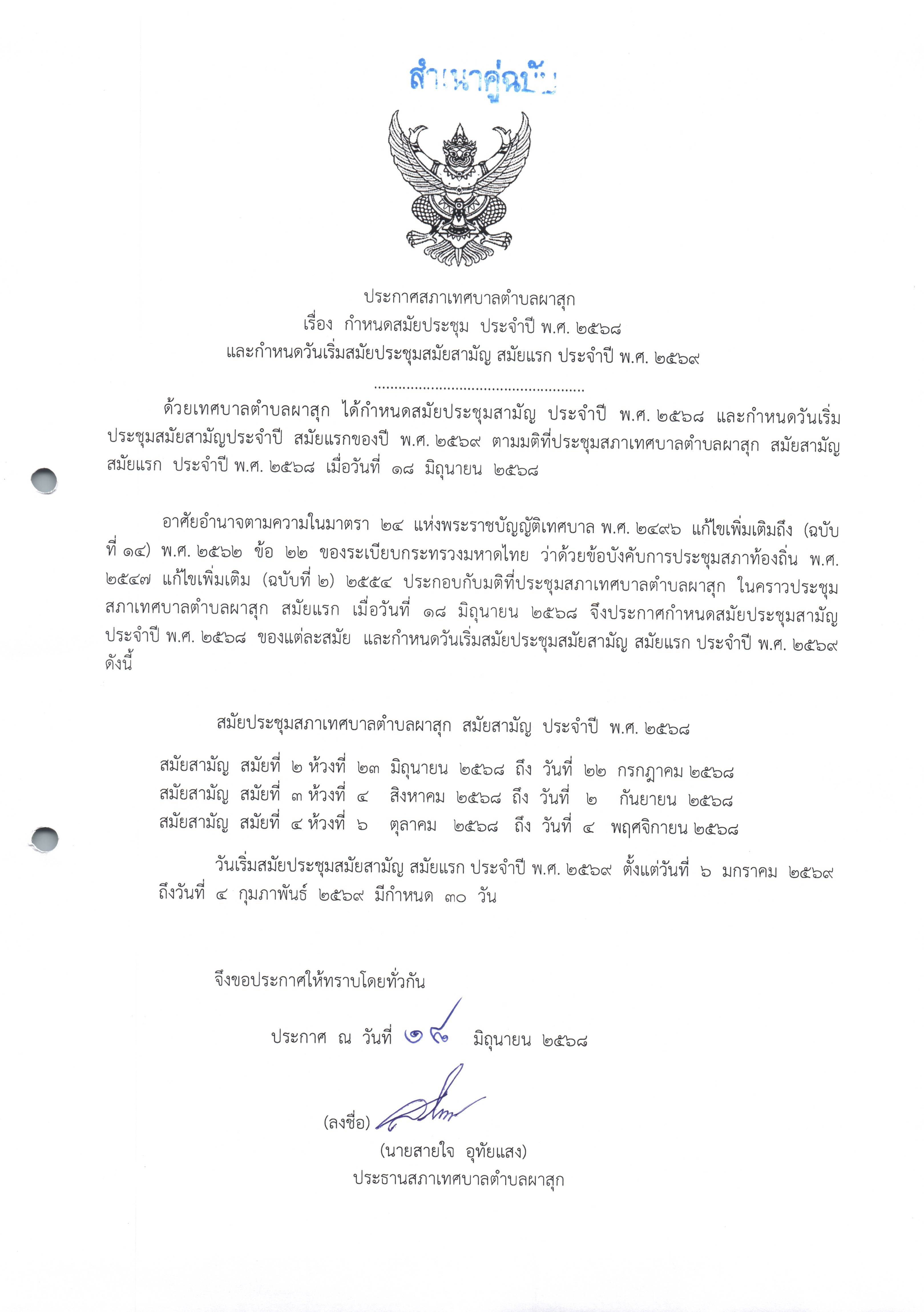 ประกาศ เรื่อง กำหนดสมัยประชุม ประจำปี พ.ศ. 2568 และกำหนดวันเริ่มสมัยสามัญ สมัยแรก ประจำปี พ.ศ. 2569