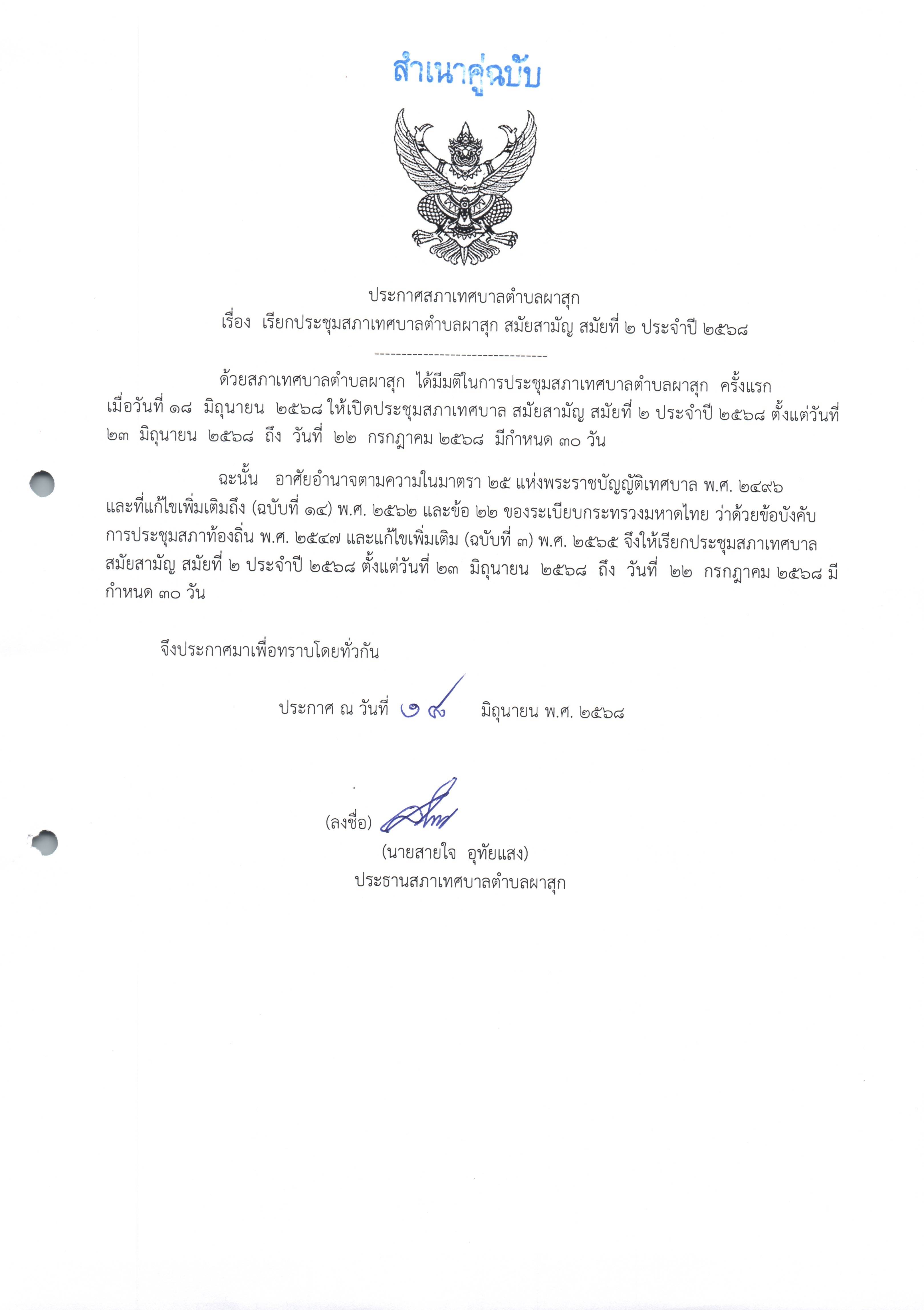 ประกาศ เรื่อง เรียกประชุมสภาเทศบาลตำบลผาสุก สมัยสามัญ สมัยที่ 2 ประจำปี 2568
