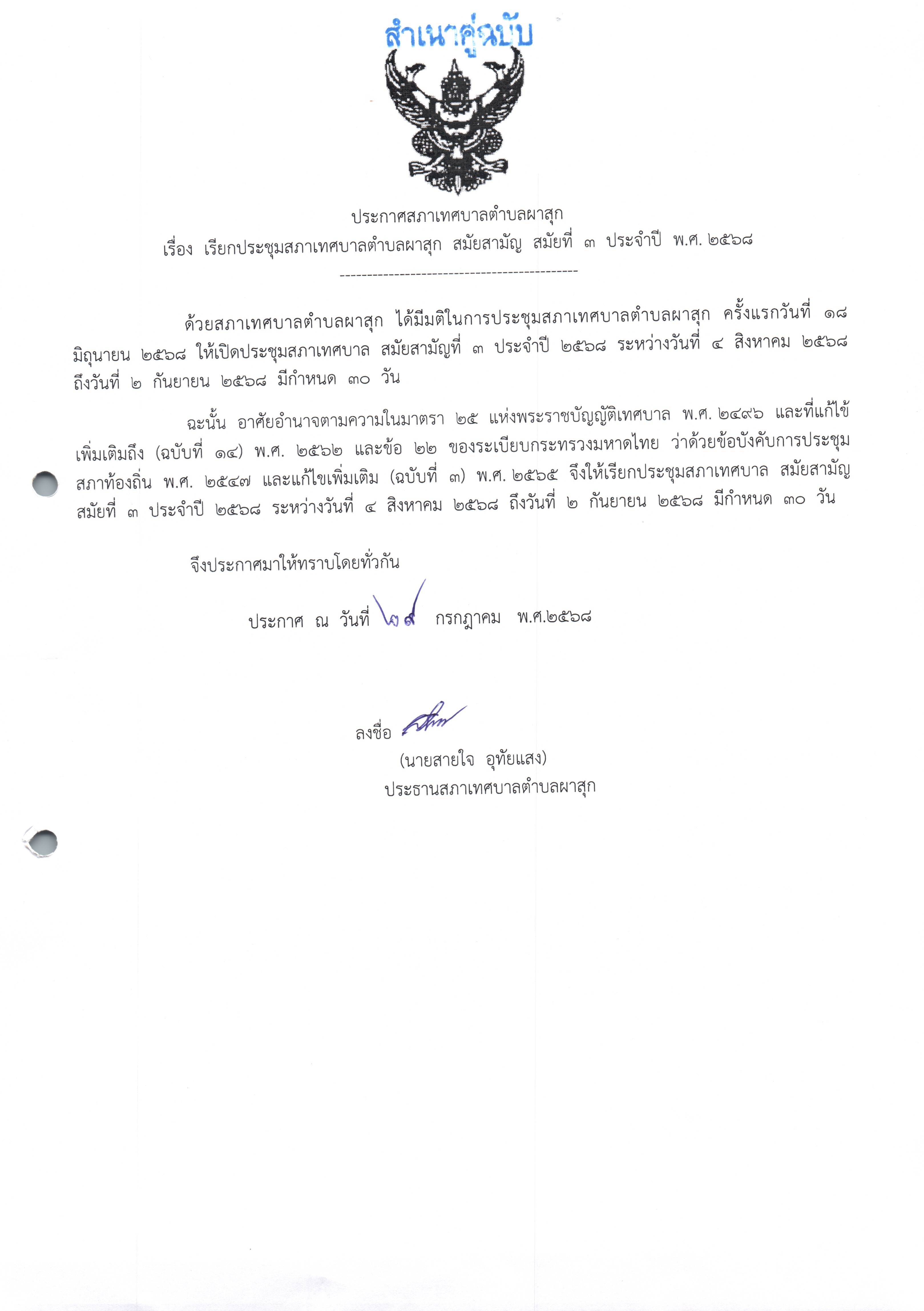 ประกาศ เรื่อง เรียกประชุมสภาเทศบาลตำบลผาสุก สมัยสามัญ สมัยที่ 3 ประจำปี 2568